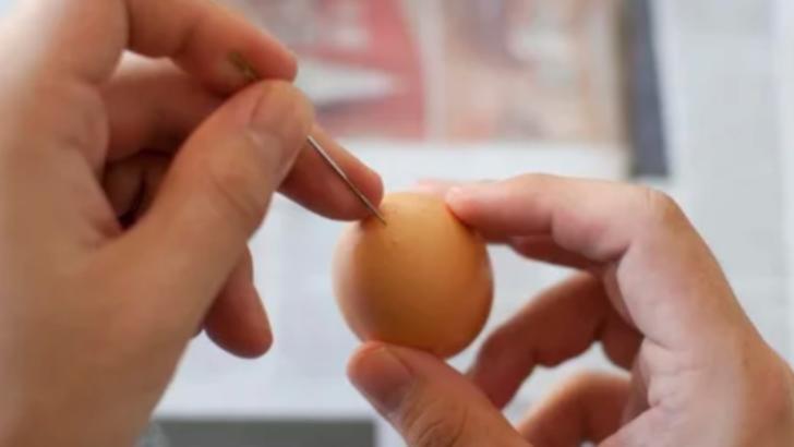 Dupa ce s-au incalzit putin, faceti o gaura cu ajutorul unui ac fin, in partea mai lata a oului, deci cea opusa varfului. Aveti grija sa nu crapati coaja. De asemenea, nu va temeti ca va curge albusul din ou, pentru ca in partea lata a oului se afla un spatiu cu aer care protejeaza continutul.