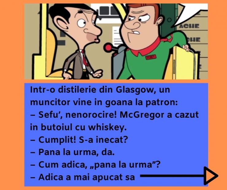 – Sefu’, nenorocire! McGregor a cazut in butoiul cu whiskey.