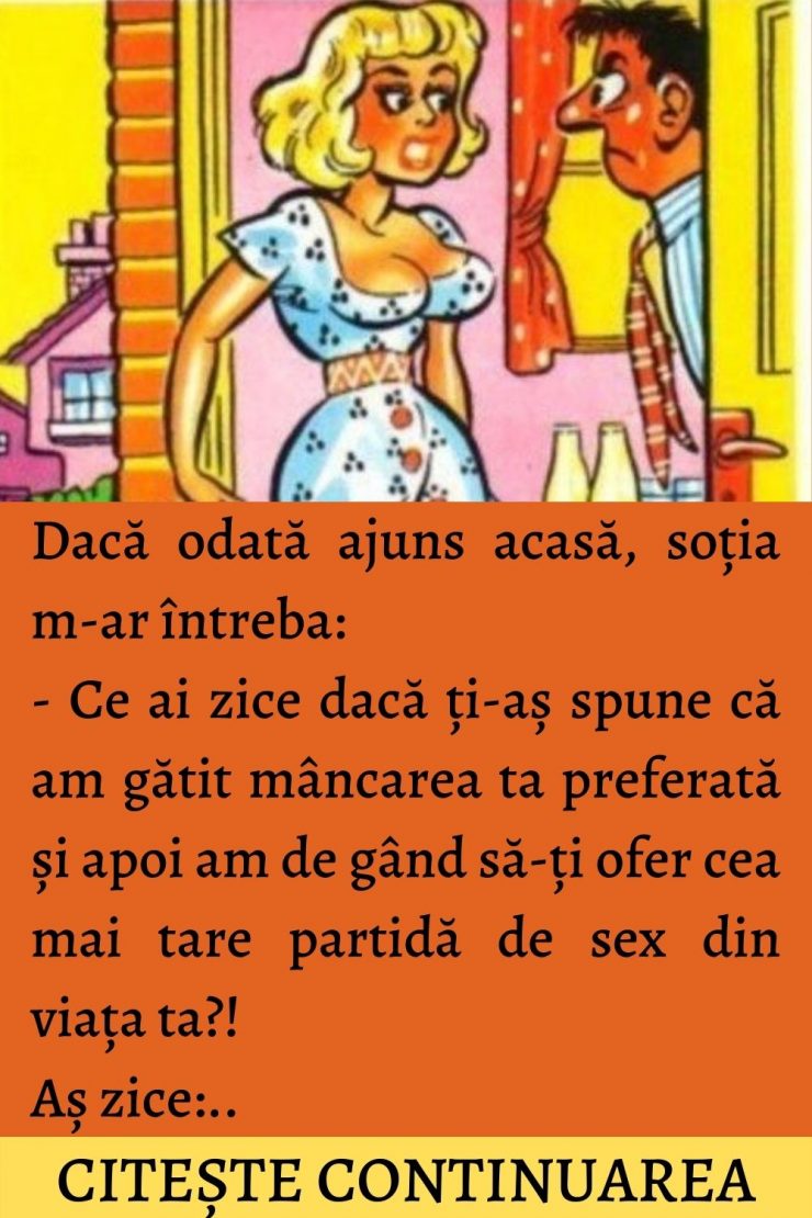 – Ce ai zice dacă ţi-aş spune că am gătit mâncarea ta preferată şi apoi am de gând să-ţi ofer cea mai tare partidă de sex din viaţa ta?!