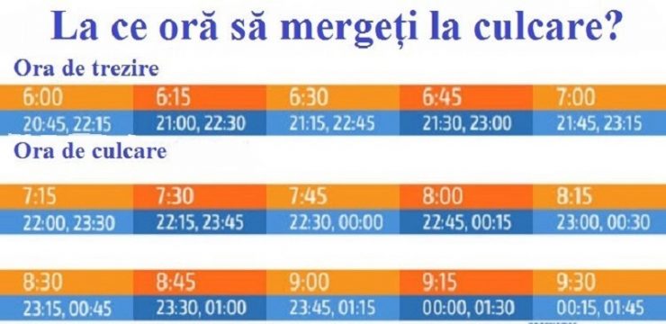O persoană obișnuită adoarme aproximativ în 15 minute, adică dacă trebuie să vă treziți la ora 6 dimineața, ar trebui să vă culcați la 20:45 sau la 22:15. Cu ajutorul acestul tabel veți ști la ce oră trebuie să mergeți la somn pentru a vă trezi odihnit: