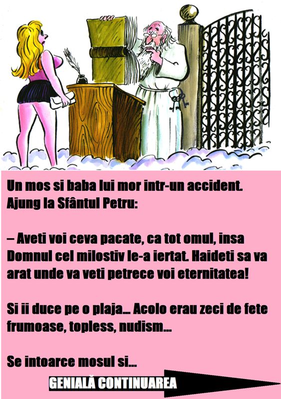 Un mos si baba lui mor intr-un accident. Se duc in fata sfantului Petru.